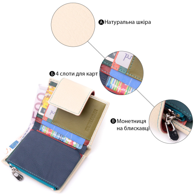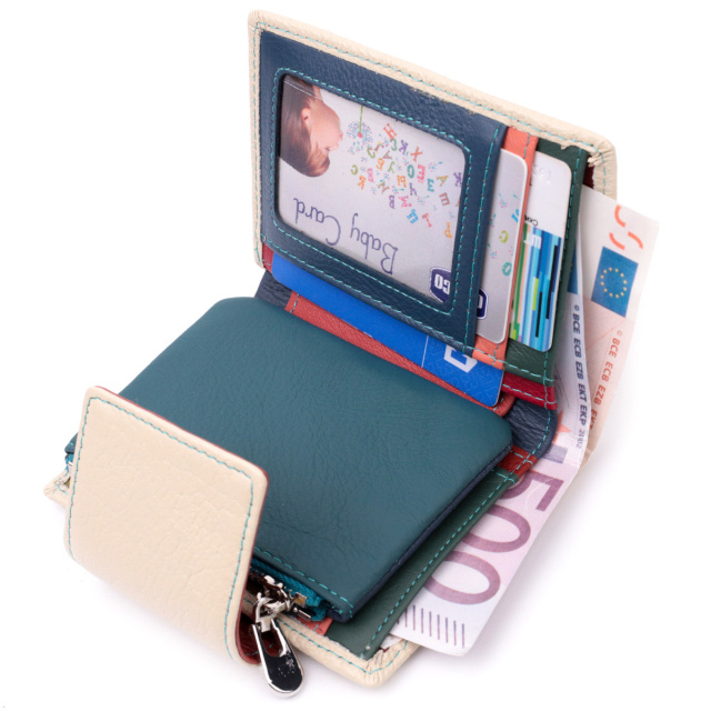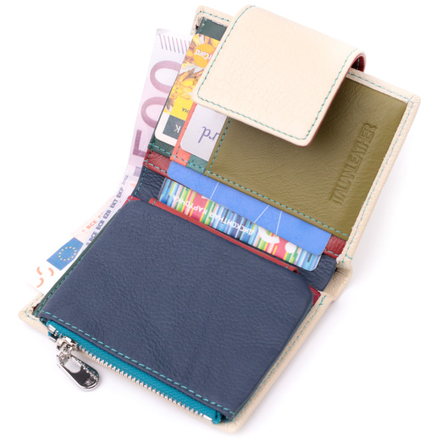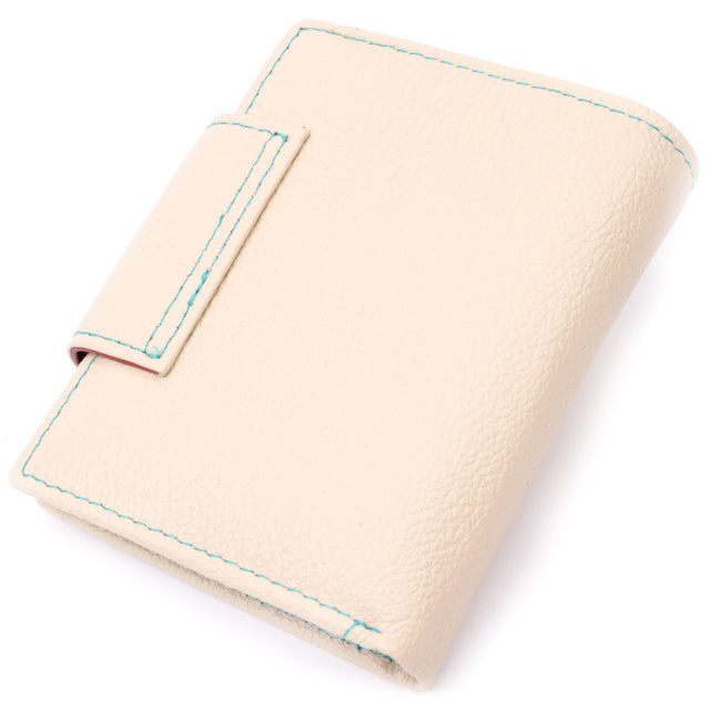 - закривається хлястиком на магніт. Стильне вертикальне портмоне в два складки зручного розміру з натуральної шкіри найвищої якості. Гаманець кремово-білого кольору зовні та різнобарвний усередині, що дуже стильно та сучасно. Шкіряне портмоне дуже практичне і служить досить довго. Аксесуар складається з основного відділення зі шкіряною перегородкою для купюр, монетниці, чотирьох осередків для карт, прозорого віконця для пропуску та чотирьох прихованих кишень. Портмоне доповнено надійною фурнітурою і прошито по краю рівним рядком бірюзового кольору. Укомплектований гаманець у фірмову картонну коробку білого кольору. Виріб стане ідеальним подарунком для дівчини будь-якого віку.