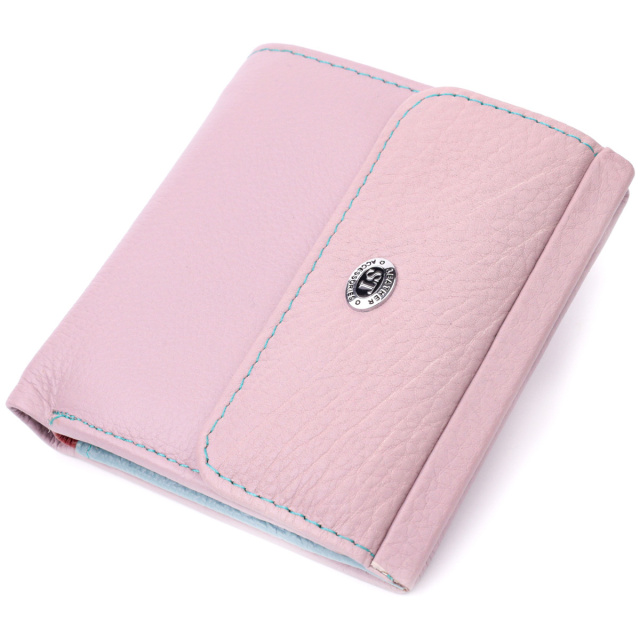 - закривається на магніт. Незвичайне кольорове портмоне для жінок середнього розміру із натуральної шкіри найвищої якості. Акцентом цього гаманця є колір, точніше кілька кольорів – він бежево-рожевого кольору зовні та багатобарвний усередині. Аксесуар складається з двох містких відділень для купюр, кишені на блискавці, чотирьох осередків для карт, прихованої кишені, прозорої кишені та кишені для монет. Зовні виріб прошитий рівним рядком бірюзового кольору по краю і прикрашений металевим логотипом компанії виробника, який розміщений вгорі посередині. Портмоне доповнено надійною фурнітурою та міцною підкладкою. Укомплектований гаманець у фірмову картонну коробку білого кольору.