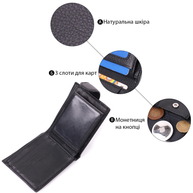 - закривається навпіл хлястиком на кнопку. Місткий чоловічий гаманець для впевнених у собі чоловіків. Аксесуар з натуральної шкіри, він складається з двох містких відділень для купюр, кишені на блискавці, двох кишень під плівкою, трьох осередків для карт, двох прихованих кишень та кишені для монет. Портмоне доповнено надійною фурнітурою та міцною підкладкою. Запакований гаманець у фірмову картонну коробку білого кольору. ОПЛАТА та ДОСТАВКА : накладний платіж з передоплатою 200 грн.Терміни відправлення : 1-3 робочих днів