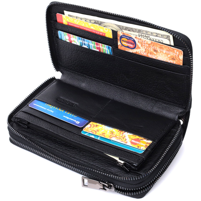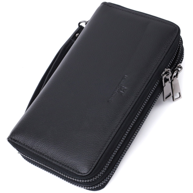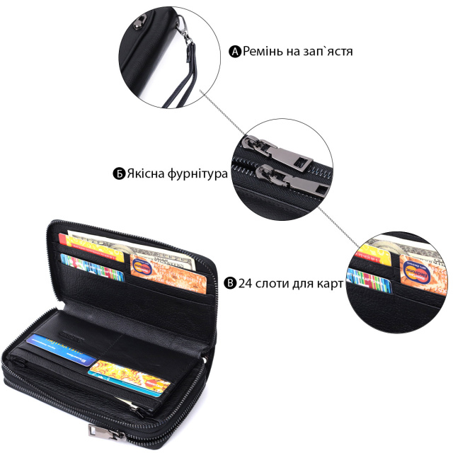 - закривається на блискавки. Просторий чоловічий клатч на два автономні відділення з високоякісної шкіри чорного кольору для впевненого у собі ділового чоловіка. Має все необхідне, щоб стати Вам незамінним аксесуаром у повсякденному рутинному житті. Ви легко помістите в нього паперові купюри, телефон, монети, документи і картки. Цей клатч можна носити як у сумці чи портфелі, чи просто як самостійний аксесуар на зап'ястя за допомогою кистьового ремінця, чи просто в руці за допомогою ручки, яка знаходиться на тильній стороні. На лицьовій стороні, вгорі посередині, розташоване тиснення з логотипом виробника, що є запорукою якості виробу. Запакований аксесуар у білу щільну картонну коробку з фірмовим логотипом. Якщо Ви вирішите такий аксесуар подарувати близькій людині, то Вам гарантовано будуть дуже вдячні. ОПЛАТА та ДОСТАВКА : накладний платіж з передоплатою 200 грн.Терміни відправлення : 1-3 робочих днів