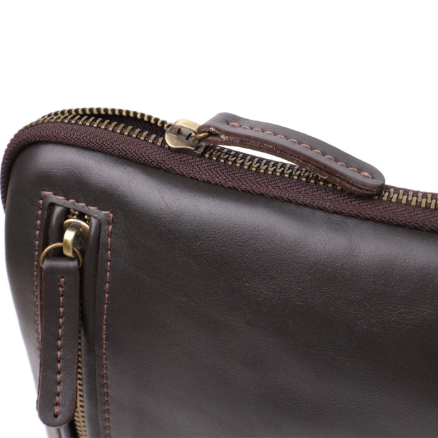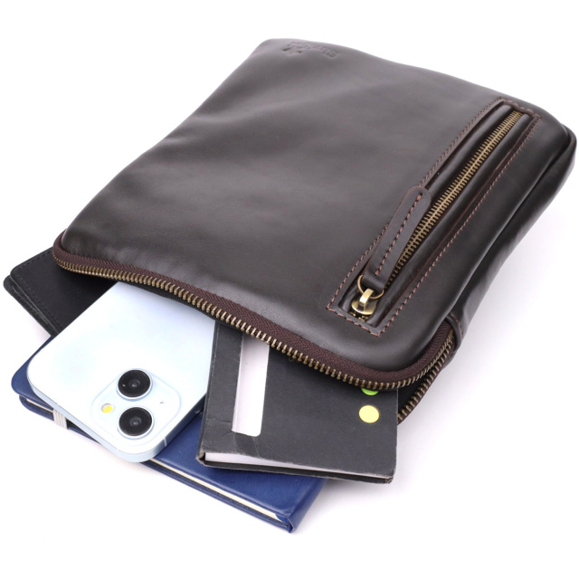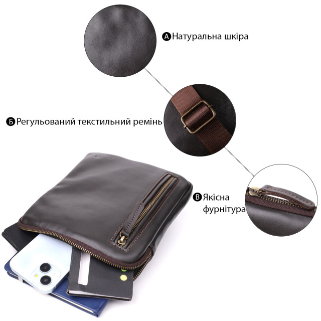 Особливості: - одне основне відділення, що закривається на блискавку; - всередині: кишеня на блискавці, відкрита кишеня та осередок для кредитних карток; - зовні: вертикальна кишеня на блискавці на лицьовій стороні та кишеня на блискавці на тильній стороні; - незнімний регульований текстильний ремінь; - фурнітура кольору латунь; - фірмове тиснення з логотипом бренду на лицьовій стороні. Ця чоловіча вертикальна сумка виготовлена українським брендом , який відомий якісними шкіряними аксесуарами та увагою до деталей. Натуральна гладка шкіра насиченого коричневого кольору наголошує на елегантності, а фірмове тиснення логотипу підтверджує оригінальність виробу.