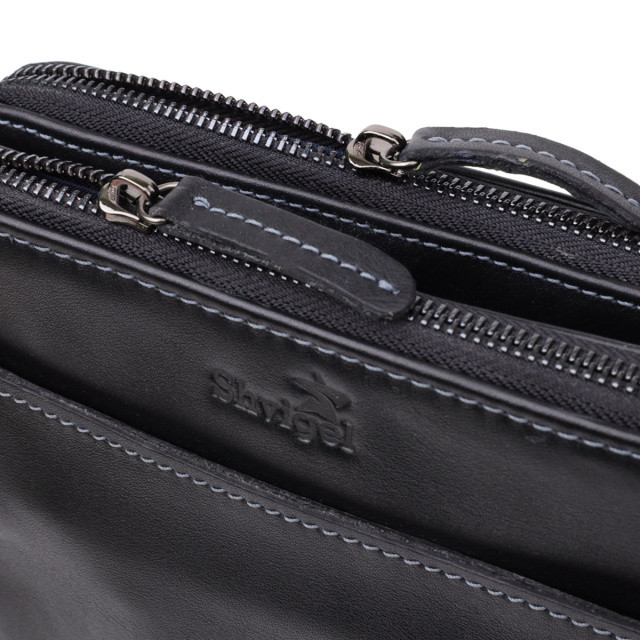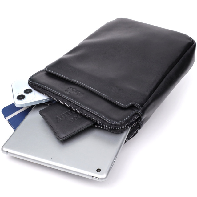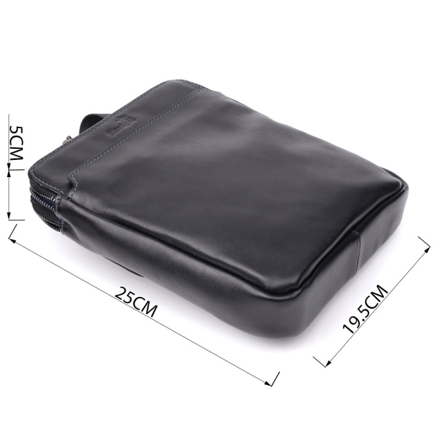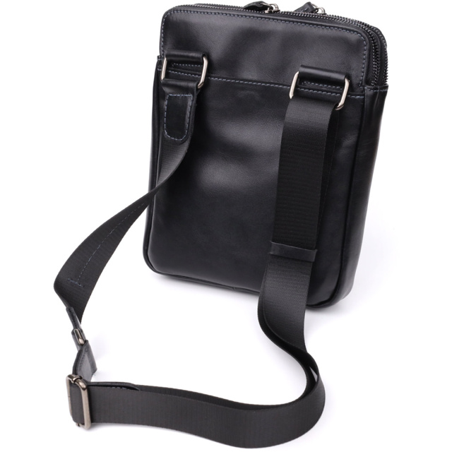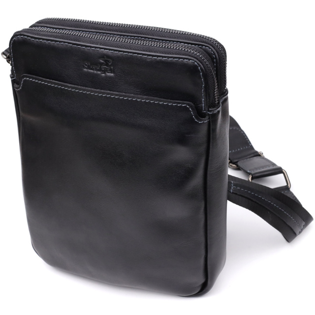 Особливості: два основні відділення на блискавці; всередині: кишеня на блискавці та відкрита кишеня для телефону або дрібниць; зовні: кишеня на блискавці на лицьовій стороні та кишеня на магніті на тильній стороні; міцний регульований текстильний ремінь із шкіряними вставками; фірмове тиснення логотипу на лицьовій стороні; фурнітура кольору латунь. Чоловіча вертикальна сумка від українського бренду, виготовлена з натуральної гладкої чорної шкіри, - це стильний аксесуар для сучасного чоловіка. Завдяки компактним розмірам та продуманій організації, у ній зручно носити документи, планшет чи щоденні речі.