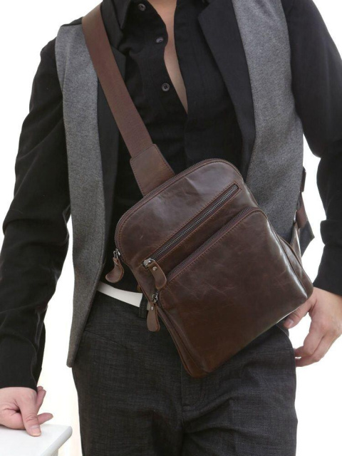 Розмір (ШхВхГ, см): 20х25.5х5. Невелика шкіряна сумка через плече. Колір фурнітури: чорне срібло. Сумка має компактні розміри, але при цьому вона досить практична і функціональна. Підкладка виробу виконана з текстильного матеріалу приємного на дотик. Колір підкладки: коричневий. Таку невелику сумочку можна піднести як подарунок школяру, так як в неї якраз поміщаються зошити. Особливості: