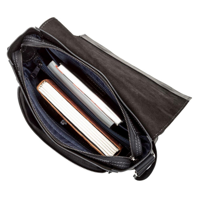 Зовні: на передній стінці розташована накладна кишеня на змійці, на задній стінці плоска кишеня на блискавці. Підкладка виконана з міцного матеріалу, в наявності плечовий ремінь. Сумка прошита міцною сірою ниткою, що надає їй міцності і оригінального вигляду. Виріб закривається на блискавку і клапаном зверху. Аксесуар упакований в пилозахисний чохол.