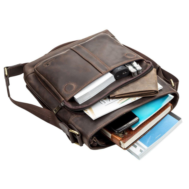 В іншому: кишені для телефону, візиток і дисконтних карт, відділення для ручок, тримач для ключів, а також потайна кишеня на блискавці. Зовні, на передній стінці під клапаном розташовані дві накладні кишені, одна з яких на змійці, на задній стінці - кишеня на блискавці. Підкладка виконана з міцного матеріалу, в наявності плечовий ремінь, а також міцна ручка для носіння в руці. Колір фурнітури: латунь. Аксесуар упакований в пилозахисний чохол.