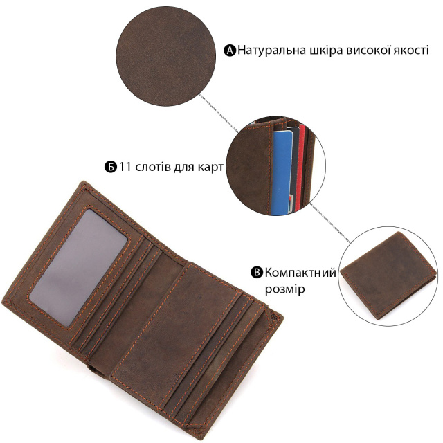 Чудовий гаманець з натуральної вінтажної шкіри компактних розмірів. Купюрник акуратно прошитий світло-коричневою ниткою. Дану модель зручно тримати в руці. Гаманець не обтяжений різними декорами. Аксесуар поставляється в текстильному пилозахисному чохлі. Всередині: