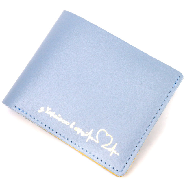 - упаковано у фетровий чохол. Стильний шкіряний гаманець, у комбінації двох кольорів блакитного зовні та жовтого всередині з патріотичним написом “З Україною в серці”. Виріб пошитий із якісної шкіри, з високими показниками зносостійкості. Портмоне має одне велике відділення для купюр усіх номіналів, а також достатню кількість відділень для карток, без застібки. Шкіряний гаманець стане чудовим подарунком на всі випадки життя. ОПЛАТА та ДОСТАВКА : накладний платіж з передоплатою 200 грн.Терміни відправлення : 1-3 робочих днів