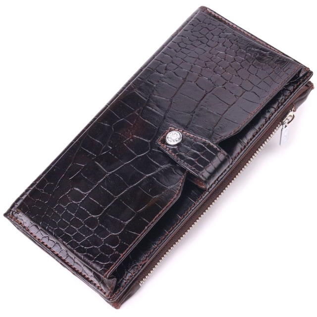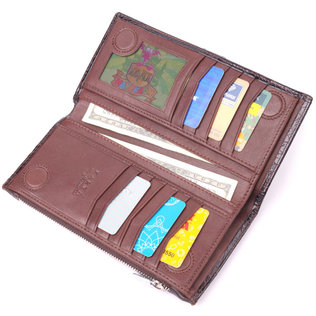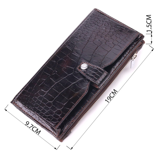 - відділення на кнопці для телефону; Гідний гаманець з натуральної фактурної шкіри, з тисненням під крокодила, у насиченому коричневому кольорі. Гаманець складається з одного глибокого відділення, чотирьох прилеглих кишень, дванадцяти осередків для карт, відділення під сіточкою, відділення на блискавці зовні та відділення для телефону, що закривається хлястиком на кнопку. У виробах цього елітного турецького бренду завжди використовуються найякісніші шкіряні матеріали та фурнітура. Аксесуар упакований у фірмову коробочку. Шкіряний виріб завжди буде чудовим подарунком для будь-якого чоловіка. ОПЛАТА та ДОСТАВКА : накладний платіж з передоплатою 200 грн.Терміни відправлення : 1-3 робочих днів
