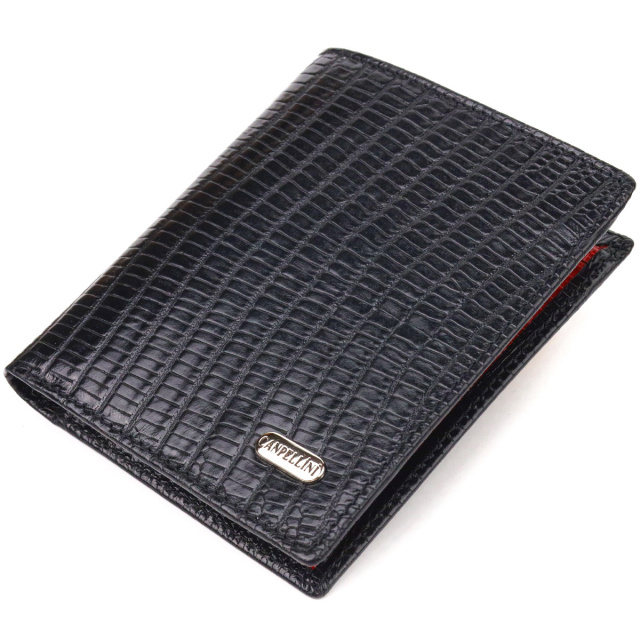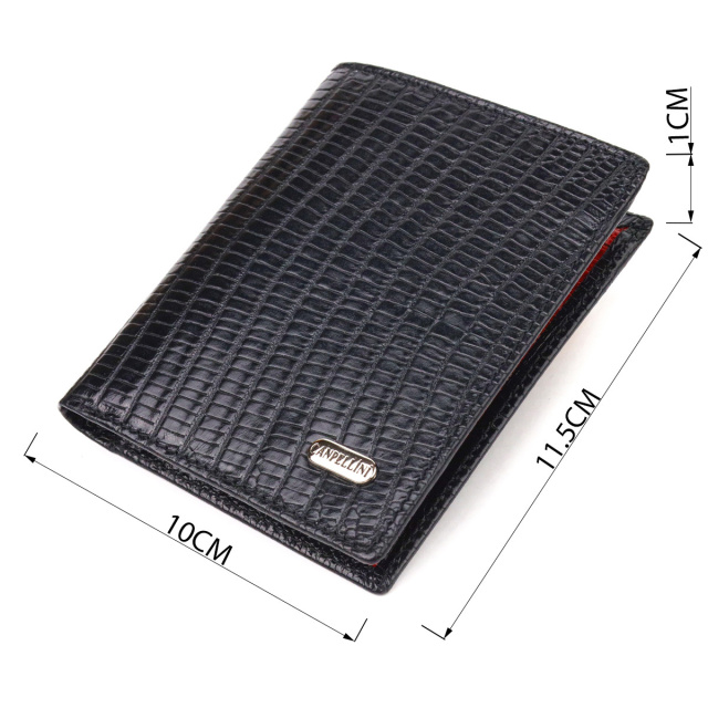 - гаманець упакований у фірмову коробочку. Комбіноване чоловіче портмоне, з натуральної фактурної шкіри, з тисненням під рептилію, у класичному чорному кольорі зовні та червоному кольорі – усередині. Аксесуар має одне основне відділення, з перегородкою, в яке поміщаються купюри всіх номіналів, три відсіки для карток, монетницю на блискавці з розширювачем, дві прилеглі кишені. На зовнішній стороні металевий логотип виробника. Колір фурнітури – срібло. Шкіряний гаманець є справді потрібним практичним подарунком. ОПЛАТА та ДОСТАВКА : накладний платіж з передоплатою 200 грн.Терміни відправлення : 1-3 робочих днів