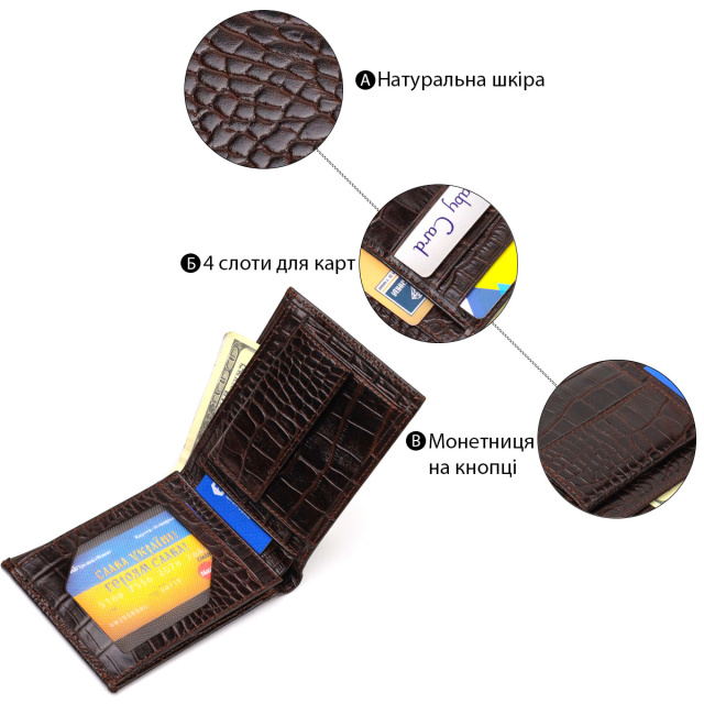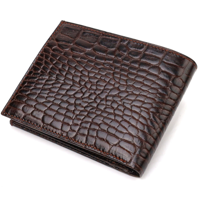 - гаманець упакований у фірмову коробочку. Чудовий чоловічий гаманець у красивому коричневому кольорі з натуральної шкіри з тисненням під крокодила. Аксесуар має одне основне відділення з перегородкою, в яке поміщаються купюри всіх номіналів, чотири кишені для карток, дві кишені під сіточкою для документів, монетницю та три прилеглі кишені. Закривається аксесуар навпіл без застібки. Запакований гаманець картонну коробку. Шкіряний гаманець є чудовим подарунком для рідних та близьких людей. ОПЛАТА та ДОСТАВКА : накладний платіж з передоплатою 200 грн.Терміни відправлення : 1-3 робочих днів