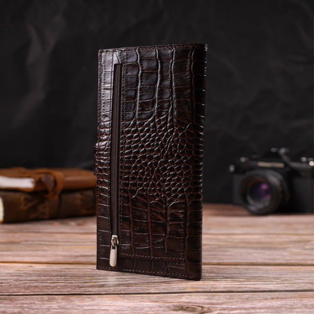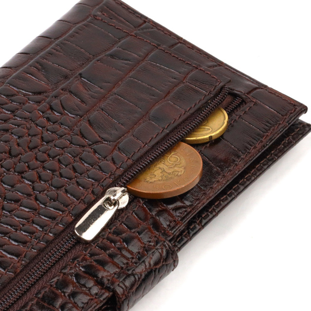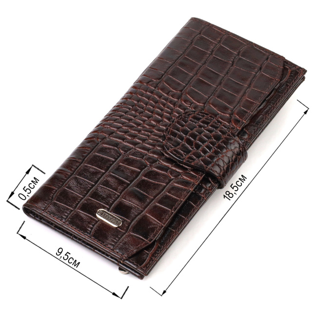 - гаманець упакований у фірмову коробочку. Практичний чоловічий гаманець із натуральної фактурної шкіри, з тисненням під крокодила. Аксесуар має одне основне вертикальне відділення для купюр усіх номіналів, одинадцять осередків для карток, кишеню під сіточкою для пропуску, п'ять прилеглих кишень та монетницю. Закривається аксесуар навпіл хлястиком на кнопку. Купуючи шкіряний аксесуар цієї фірми, собі або на подарунок, будьте певні, що він прослужить Вам не один рік. ОПЛАТА та ДОСТАВКА : накладний платіж з передоплатою 200 грн.Терміни відправлення : 1-3 робочих днів