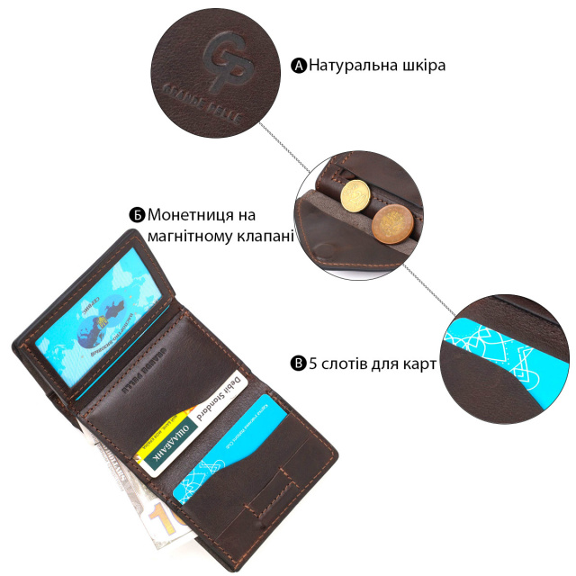 - монетниця зовні. Зручне чоловіче портмоне для тих хто цінує зручність, стиль та мінімалізм. Виконано виріб із натуральної висококласної шкіри з м'якою приємною фактурою. Усередині є просторе відділення для купюр та зручні слоти для пластикових карток, також зовні є монетниця, що закривається клапаном на магніт. Закривається аксесуар у три складення на магніт. Запаковано портмоне у фірмовий чохол. ОПЛАТА та ДОСТАВКА : накладний платіж з передоплатою 200 грн.Терміни відправлення : 1-3 робочих днів