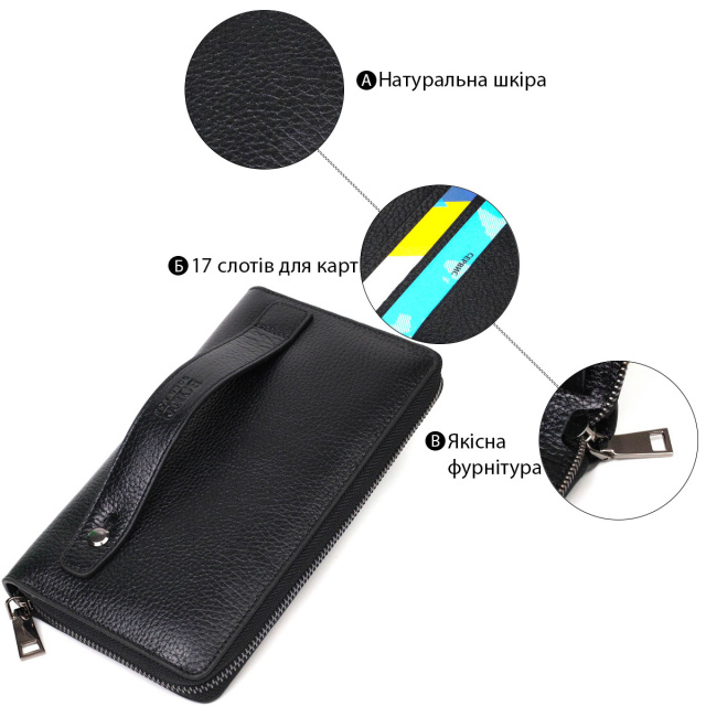 Практичний чоловічий клатч із натуральної м'якої шкіри, гаманець закривається на блискавку, всередині можна без проблем розміщувати паперові банкноти, банківські картки та навіть смартфон. Аксесуар складається з двох відділень для купюр, двох прилеглих кишень, сімнадцяти слотів для кредиток та монетниці на блискавці. Є також ручка долоні на тильній стороні клатчу. Продається гаманець у гарній коробці від виробника. Якісний і надійний клатч - саме такий аксесуар повинен бути у кожної людини, що поважає себе. ОПЛАТА та ДОСТАВКА : накладний платіж з передоплатою 200 грн.Терміни відправлення : 1-3 робочих днів