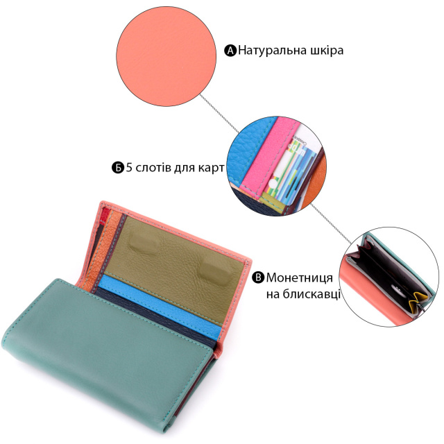 - закривається на магніти. Жіноче портмоне в три складання зручного середнього розміру з натуральної шкіри найвищої якості. Перше, що впадає в око це колірне рішення, замість однотонного аксесуара ми маємо різнокольоровий, який містить два основні зовнішні кольори і кілька додаткових всередині. Шкіряне портмоне дуже практичне і служить досить довго. Аксесуар складається з двох містких кишень для купюр, кишені на блискавці через всю довжину, п'яти осередків для карт, прозорого віконця для пропуску та зовнішньої кишені на блискавці з перегородкою, що чудово прослужить для монет. Портмоне доповнено надійною фурнітурою. Укомплектований гаманець у фірмову картонну коробку білого кольору. Виріб стане ідеальним подарунком для дівчини будь-якого віку.