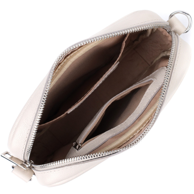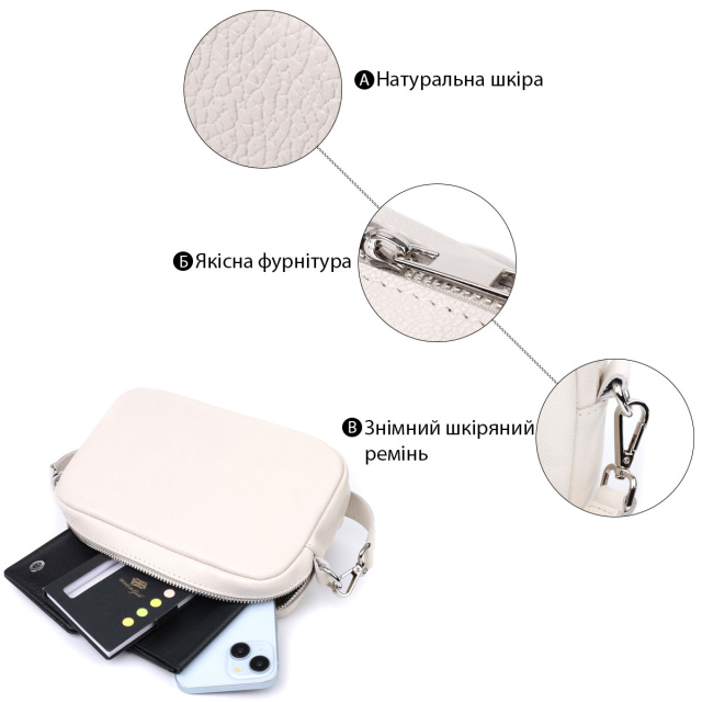 - знімний шкіряний ремінець. Універсальна жіноча сумка, яку можна носити через плече як крос-боді, на плечі і як клатч в руках, для цього ремінець легко відстібається. Виріб виконаний у красивому бежевому кольорі із зернистої натуральної шкіри стійкої до подряпин. Шкіра м'яка, приємна на дотик із високими показниками зносостійкості. Відмінний варіант як на кожнен день, так і на вечір. Сумка добре тримає форму, має міцну підкладку, фурнітура срібного кольору – стійка не змінює свій колір у процесі носіння. Аксесуар чудово поєднується з усіма стилями в одязі та може стати чудовим подарунком на будь-яке свято. ОПЛАТА та ДОСТАВКА : накладний платіж з передоплатою 200 грн.Терміни відправлення : 1-3 робочих днів