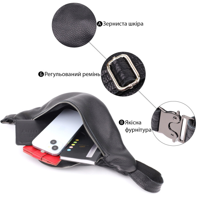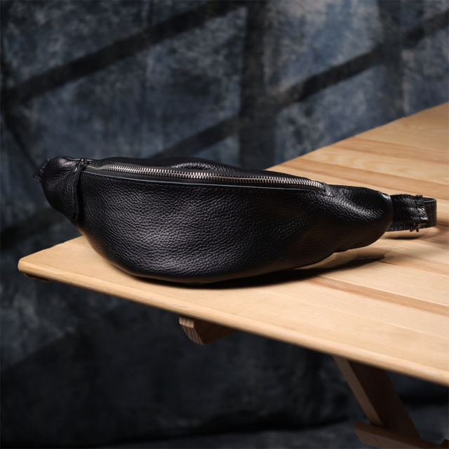 - стильна прошивка деталей чорною ниткою. Практична бананка для чоловіків від українського бренду виконана з високоякісної натуральної шкіри з виразною зернистою фактурою, яка називається - флотар, вона відрізняється м'якістю, міцністю та стійкістю до зношування. Шкіра флотар наголошує на індивідуальності та впевненості власника, а її фактура робить сумку стійкою до зовнішніх впливів — відмінний вибір для активного способу життя. Вона підкреслює статус та смак власника, а класичний чорний колір робить аксесуар універсальним та доречним у будь-якій ситуації – від міської метушні до ділових зустрічей. Незважаючи на компактні розміри, сумка містка: легко вміщує смартфон, документи, ключі та гаманець. Основне відділення на блискавці і одна додаткова кишеня забезпечують зручну організацію простору, а текстильно-шкіряний ремінь, що регулюється, дозволяє носити сумку на поясі або через груди — як вам зручно. Ця модель ідеально підійде як для повсякденного використання у місті, так і для подорожей.