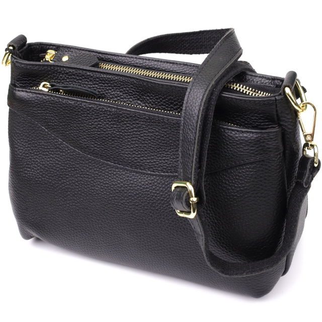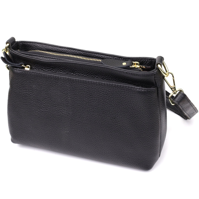 - знімний шкіряний ремінець. Жіноча шкіряна сумка чорного кольору з формостійким дном класика, елегантність і практичність в одному аксесуарі. Ця стильна та універсальна модель виконана з натуральної шкіри глибокого чорного відтінку, який залишається завжди актуальним та легко поєднується з будь-яким стилем одягу. Чорний колір підкреслює строгість та вишуканість образу, а формостійке дно дозволяє сумці зберігати чітку та акуратну форму навіть при активному використанні. Три основні відділення, кожне з яких закривається на блискавку, забезпечують зручну та безпечну організацію простору для всіх необхідних речей. Усередині центрального відділення знаходяться дві кишені — потайна на блискавці і відкрита — для зберігання дрібниць та гаджетів. Сумка оснащена одним шкіряним знімним ремінцем, який дозволяє носити її на плечі або через плече, забезпечуючи комфорт і свободу рухів. Фурнітура виконана в теплому кольорі жовтого золота, що створює елегантний контраст з насиченим чорним кольором шкіри та підкреслює високий рівень якості виробу. Ця чорна шкіряна сумка з формостійким дном ідеальний вибір для жінок, які цінують стиль, якість і функціональність в одному аксесуарі. ОПЛАТА та ДОСТАВКА : накладний платіж з передоплатою 200 грн.Терміни відправлення : 1-3 робочих днів