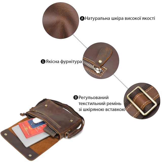 Якісна сумка з натуральної шкіри Crazy horse. Багато клієнтів люблять шкіру такого плану за її зовнішній вигляд і вінтажність. Аксесуари з такої шкіри через час виглядають дуже розкішно і з потертостями, що надає ефект старовини. По краях модель прошита світлим рядком. Сумка доповнена текстильним ремінцем зі шкіряною вставкою для зручної експлуатації. Усередині якісна текстильна підкладка коричневого кольору. Сумка дуже практична і функціональна. Сумка дуже комфортна у використанні і носиться досить довго. Буде чудовим подарунком для близької людини.