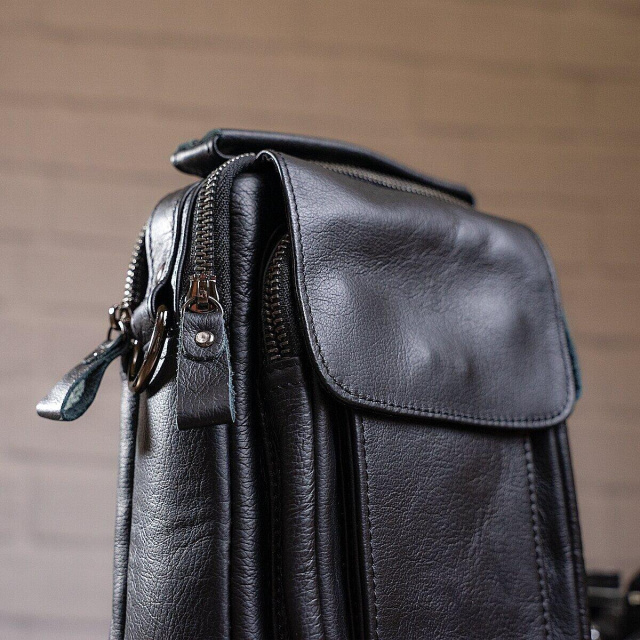 - кишеня на блискавці на тильній стороні. Стильна чоловіча сумка з натуральної шкіри з ремінцем зі шкіряною вставкою, що знімається. По краях аксесуар прошитий чорною ниткою. Всі шви рівні, ниток, що стирчать, немає. Усередині аксесуару щільна текстильна підкладка коричневого кольору. У сумці є ручка для носіння в руках. Дуже сучасна і продумана модель. Виробництво - фабричний Китай хорошої якості. Підійде для щоденного використання. Хороший варіант на роботу або в поїздку. Буде чудовим подарунком з будь-якого приводу.