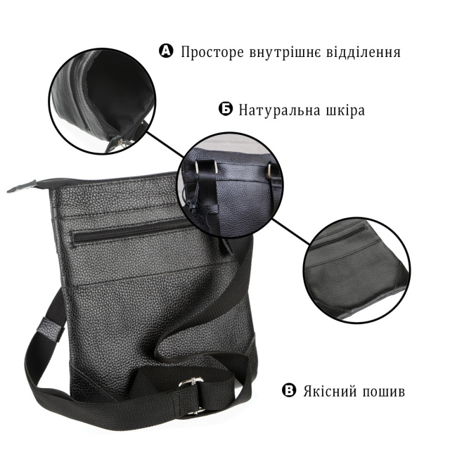 У виробництві даної сумки, використовувалася натуральна фактурна шкіра, більше відома як флотар, так само була взята міцна зносостійка фурнітура та якісний текстильний матеріал для внутрішньої підкладки.