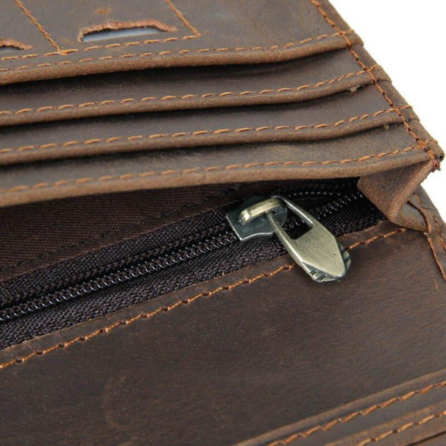 Сучасний шкіряний купюрник з оригінальним малюнком на лицьовій стороні. Гаманець акуратно прошитий понад-міцною ниткою коричневого кольору. Даний аксесуар зручно тримати в руці, але через свої розміри він не повністю поміщається в кишеню джинсів. Гаманець упакований в текстильний пилозахисний мішечок. Всередині: