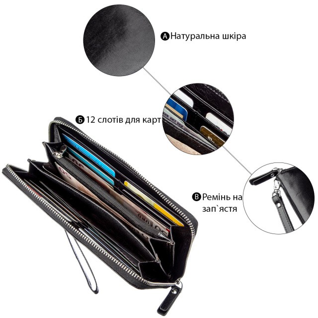 - чоловіче портмоне-клатч з натуральної шкіри на блискавці;