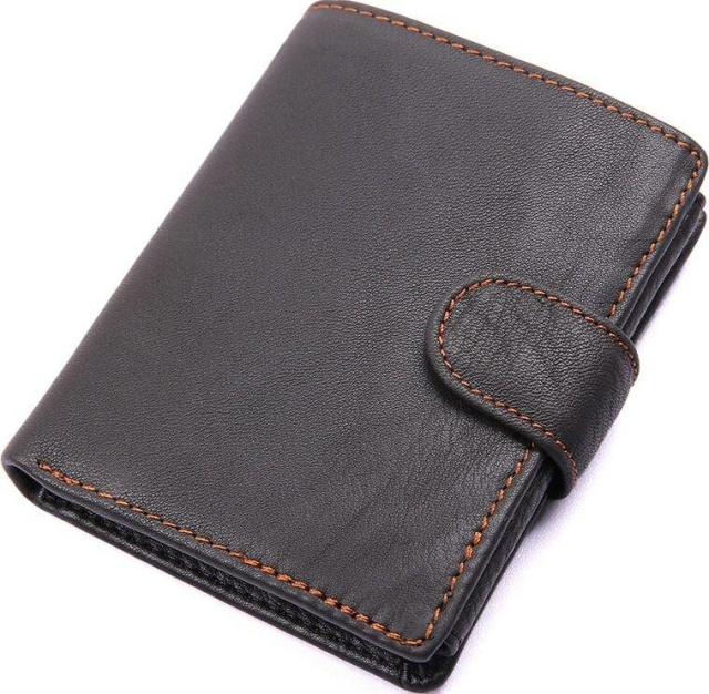 Розмір (ШхВ, см): 9.5 на 12. Зручний чоловічий гаманець чорного кольору. Аксесуар виконаний з натуральної високоякісної глянцевої шкіри приємної на дотик. Гаманець акуратно прошитий світло-коричневою ниткою, що надає йому оригінального виду. Колір фурнітури: латунь. Виріб упаковано в текстильний пилозахисний мішечок білого кольору. Всередині: