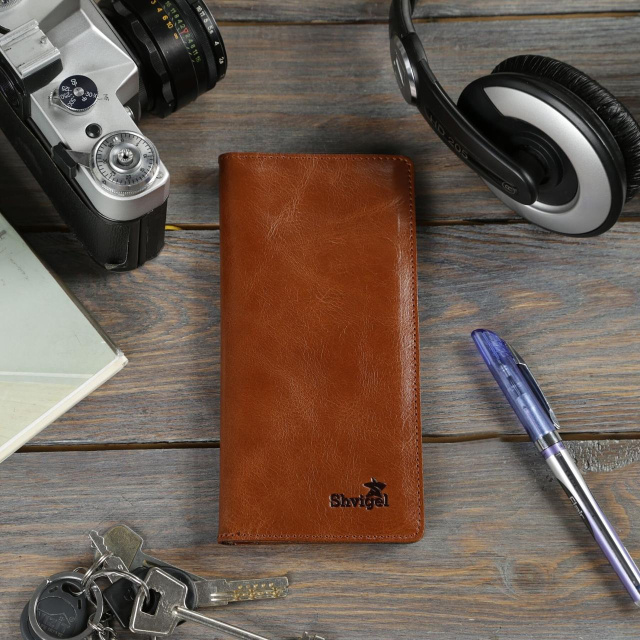 Добротний чоловічий гаманець з натуральної високоякісної шкіри. Аксесуар виконаний в світло-коричневому кольорі. Шкіра має легкий блиск. Гаманець прошитий ниткою. На зовнішній стороні (в правому нижньому кутку) знаходиться логотип компанії-виробника . Аксесуар упакований в текстильний пилозахисний мішечок. Всередині: