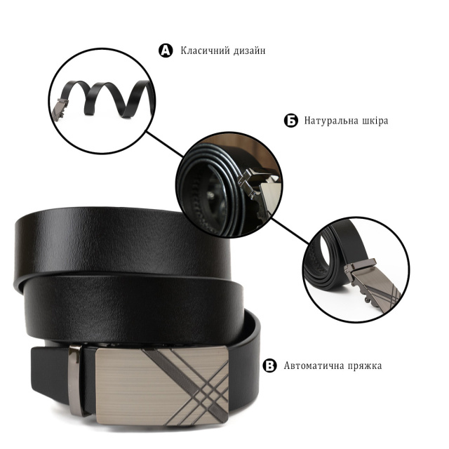 Довжина: 122 см. Чорний, класичний ремінець з автоматичною пряжкою з діагональною висічкою на металі. Пряжка виготовлена з якісного сплаву. Ремінь підійде для вас, якщо ви в пошуках солідної моделі, яка підкреслить ваш статус. Щільна шкіра, витриманий дизайн в поєднанні з оригінальною пряжкою роблять модель особливо привабливою. Підберіть подарункову упаковку і замовте даний ремінь на подарунок для вашого чоловіка. Впевнені, що такий подарунок принесе тільки позитивні емоції. ОПЛАТА та ДОСТАВКА : накладний платіж з передоплатою 200 грн.Терміни відправлення : 1-3 робочих днів