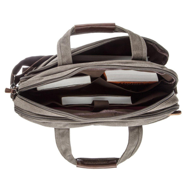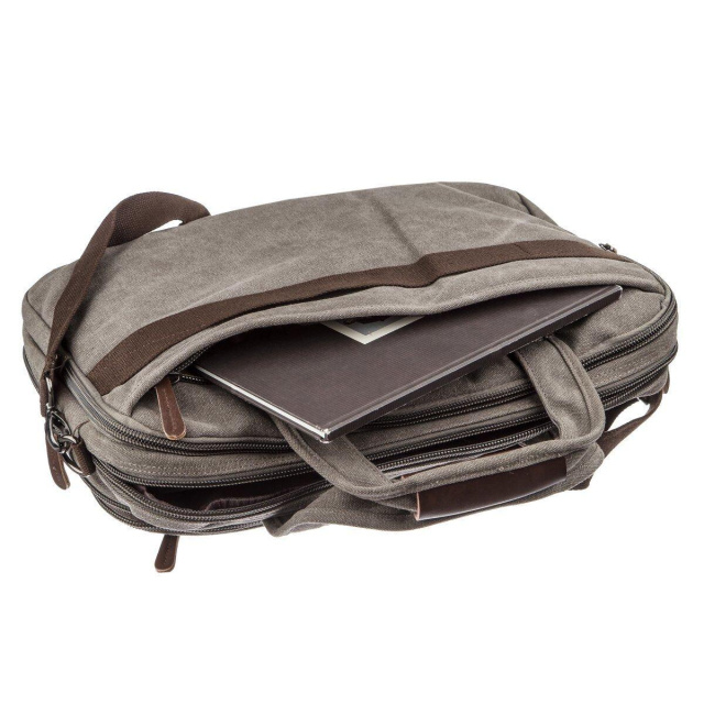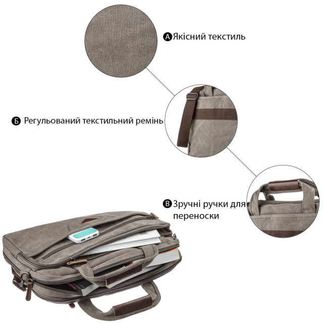 - підкладка з коричневої тканини. Текстильна сумка для ноутбука діагоналлю 15.6 дюймів. Аксесуар приглушеного сірого кольору. У комплекті до моделі йде знімний текстильний, регульований ремінець. Особливістю даної моделі є те, що ви можете регулювати її наповненість за допомогою блискавки знизу. Сумка легко преться. Модель чудово підійде як до ділового, спортивного так і повсякденного стилю. Сумка - хороший варіант для ручної поклажі в літак. Текстильна сумка досить практична і надійна. ОПЛАТА та ДОСТАВКА : накладний платіж з передоплатою 200 грн.Терміни відправлення : 1-3 робочих днів