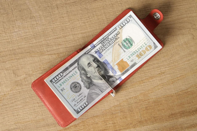 Стильний шкіряний затискач червоного кольору. Аксесуар виконаний з натуральної високоякісної вінтажної шкіри. Колір фурнітури: срібло. Виріб акуратно прошито надміцною червоною ниткою. На задній зовнішній стороні аксесуара знаходиться кишенька для пластикових карток. Затиск упакований у фірмовий текстильний пилозахисний чохол. Всередині: