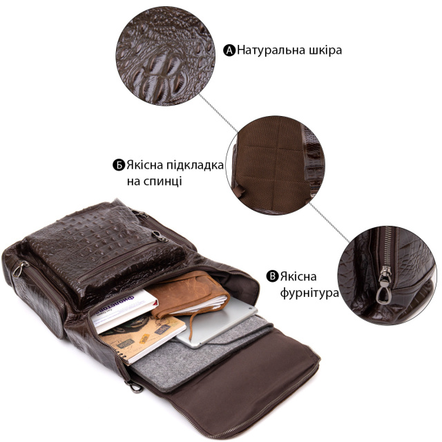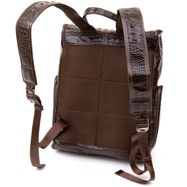 Місткий рюкзак з щільної, блискучої шкіри, яка тримає форму. Аксесуар виконаний в коричневому кольорі і доповнений якісною фурнітурою сріблястого кольору. Виріб під рептилію. Рюкзак дуже функціональний і практичний. Підійде дана модель як для подорожей, так і на кожен день і як рюкзак для ноутбука. Виглядає дуже солідно і дорого. З таким рюкзаком буде зручно і ваші руки залишаться вільними. На тильній стороні ущільнена спинка сіткою для вашого комфорту. Рекомендуємо рюкзак до покупки як для себе, так і на подарунок. ОПЛАТА та ДОСТАВКА : накладний платіж з передоплатою 200 грн.Терміни відправлення : 1-3 робочих днів