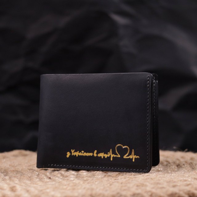 - упаковано у фетровий чохол. Шкіряний надійний гаманець чорного кольору з патріотичним написом “З Україною в серці”. Виріб пошитий із якісної вінтажної шкіри, з високими показниками зносостійкості. Портмоне має одне велике відділення для купюр усіх номіналів, а також достатню кількість відділень для карток, без застібки. Шкіряний гаманець стане чудовим подарунком на всі випадки життя. ОПЛАТА та ДОСТАВКА : накладний платіж з передоплатою 200 грн.Терміни відправлення : 1-3 робочих днів