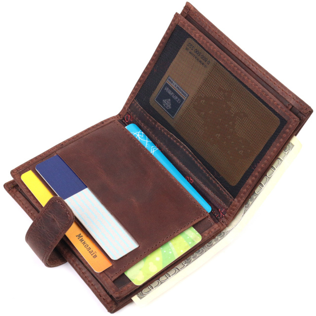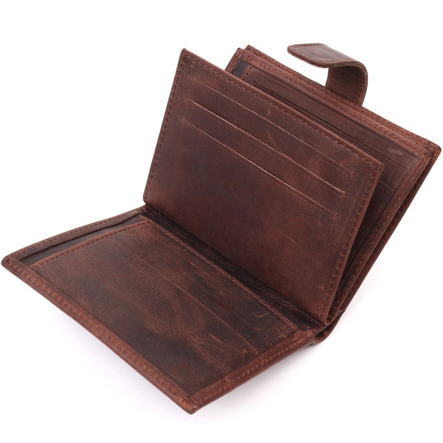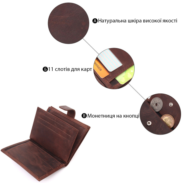 - виріб упакований у фірмову коробку. Стильне компактне портмоне з натуральної вінтажної шкіри, що закривається хлястиком на кнопку. Виріб має велику кишеню для купюр. Усередині достатньо осередків для кредиток. Виріб продуманий для сучасної людини. Виріб має насичений коричневий колір. Оригінальний аксесуар вигідно виділить вас із натовпу. Гаманець стане чудовим подарунком для Ваших близьких. ОПЛАТА та ДОСТАВКА : накладний платіж з передоплатою 200 грн.Терміни відправлення : 1-3 робочих днів