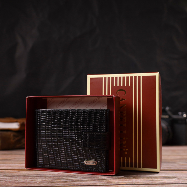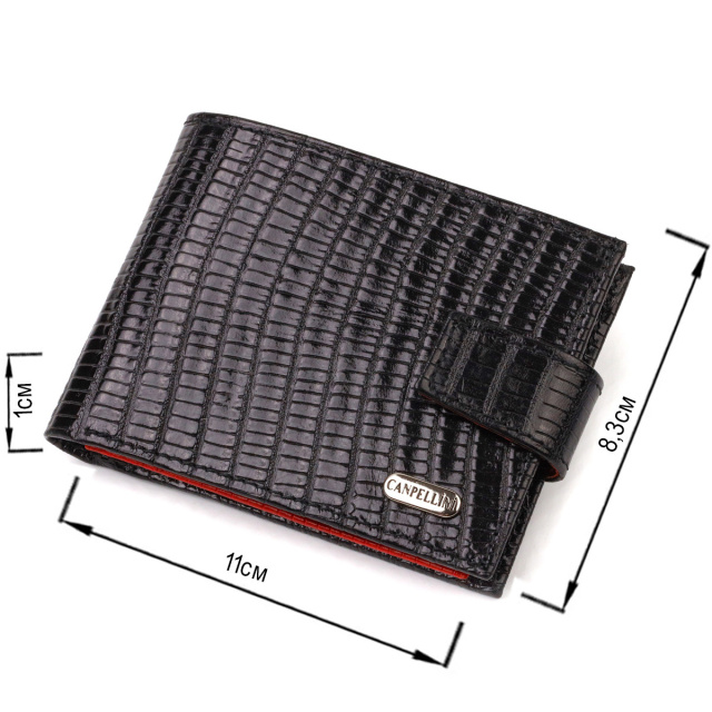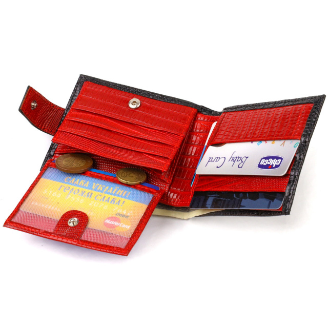 Лакований чоловічий гаманець, з натуральної фактурної шкіри, у комбінації двох кольорів чорного зовні та червоного всередині. Аксесуар має одне основне відділення з перегородкою, в яке поміщаються купюри всіх номіналів, дев'ять кишень для карток, дві з яких під сіточкою, монетниця та дві прилеглі кишені. Закривається аксесуар хлястиком на кнопку. Колір фурнітури – срібло. Ви легко зможете помістити його в кишеню штанів чи маленьку сумку. Запакований гаманець картонну коробку. Шкіряний гаманець є чудовим подарунком для рідних та близьких людей. ОПЛАТА та ДОСТАВКА : накладний платіж з передоплатою 200 грн.Терміни відправлення : 1-3 робочих днів