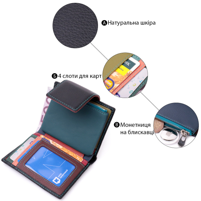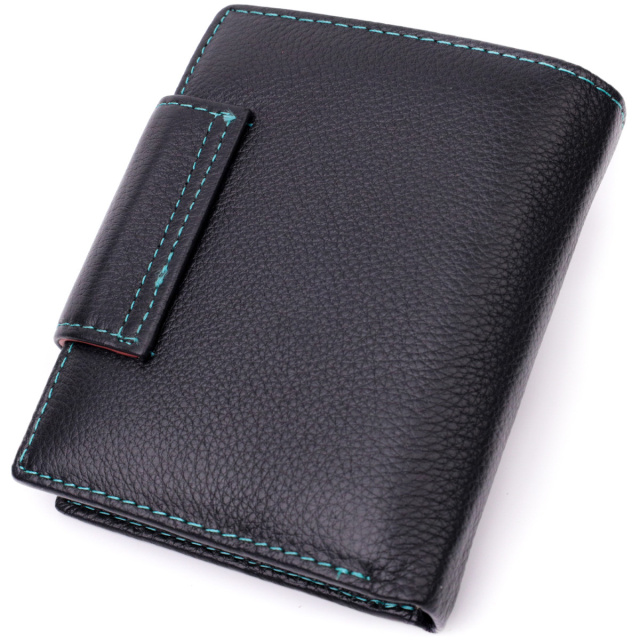 - закривається хлястиком на магніт. Модне вертикальне портмоне в два додавання зручного розміру з натуральної шкіри найвищої якості. Гаманець чорного кольору зовні та різнобарвний усередині, що дуже стильно та сучасно. Шкіряне портмоне дуже практичне і служить досить довго. Аксесуар складається з основного відділення зі шкіряною перегородкою для купюр, монетниці, чотирьох осередків для карт, прозорого віконця для пропуску та чотирьох прихованих кишень. Портмоне доповнено надійною фурнітурою і прошито по краю рівним рядком бірюзового кольору. Укомплектований гаманець у фірмову картонну коробку білого кольору. Виріб стане ідеальним подарунком для дівчини будь-якого віку.