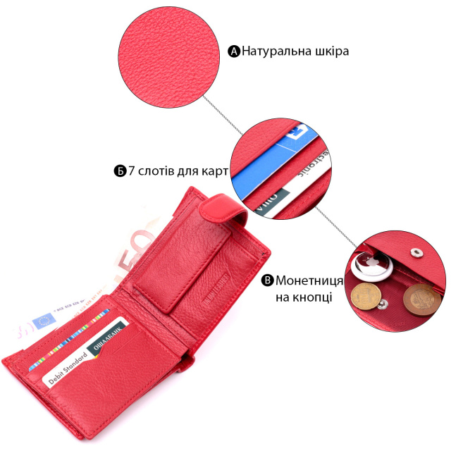 - закривається хлястиком на кнопку. Яскраве портмоне в два складання зручного середнього розміру з натуральної шкіри найвищої якості. Аксесуар складається з двох містких кишень для купюр, кишені на блискавці через всю довжину, семи осередків для карт, прозорого віконця для пропуску, двох прихованих кишень та кишеньки для монет. Портмоне доповнено надійною фурнітурою та міцною підкладкою. Укомплектований гаманець у фірмову картонну коробку білого кольору. Виріб із натуральної шкіри стане ідеальним подарунком на будь-яке свято.