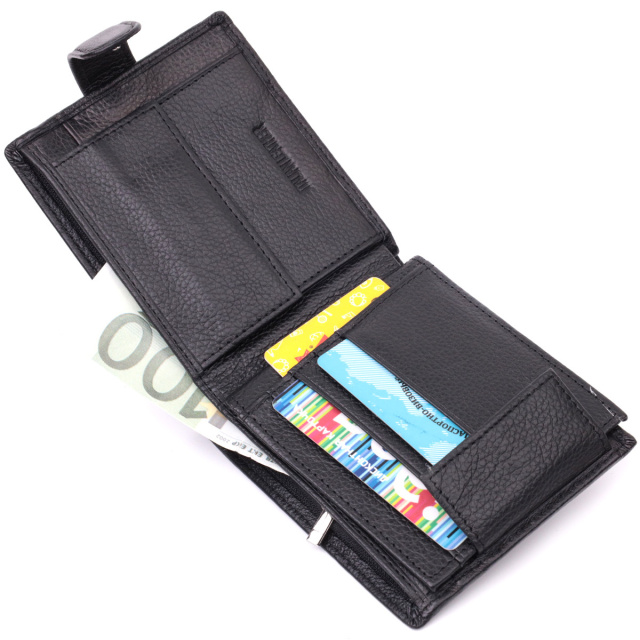 - закривається хлястиком на кнопку. Практичне портмоне для чоловіків із натуральної шкіри найвищої якості. Аксесуар складається з двох містких відділень для купюр, кишені на блискавці, на всю довжину, дванадцяти осередків для карт, чотирьох прихованих кишень та кишені для монет. Зовні виріб прошитий рівним рядком по краю і прикрашений металевим логотипом компанії виробника. Портмоне доповнено надійною фурнітурою та міцною підкладкою. Запакований гаманець у фірмову картонну коробку білого кольору.