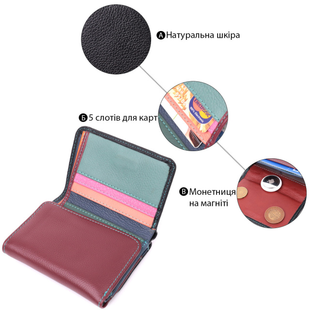 - закривається в три складання клапаном на магніт. Якісний жіночий гаманець середнього розміру із натуральної шкіри. Відмінна риса цього гаманця двокольорова зовнішня частина та багатобарвна внутрішня частина. Дана модель потрійного додавання, яка закривається на клапан з магнітом. Усередині є два відділення для купюр, монетниця, п'ять слотів під пластикові карти, одне віконце для фото, а також два приховані відділення. Відмінний функціонал та зручний розмір створює ідеальну модель гаманця для повсякденного використання. ОПЛАТА та ДОСТАВКА : накладний платіж з передоплатою 200 грн.Терміни відправлення : 1-3 робочих днів