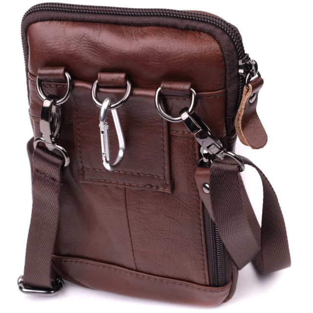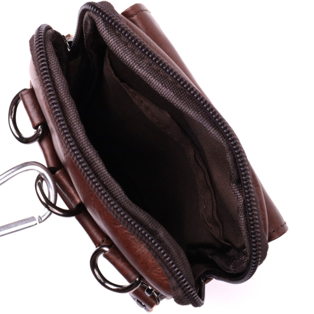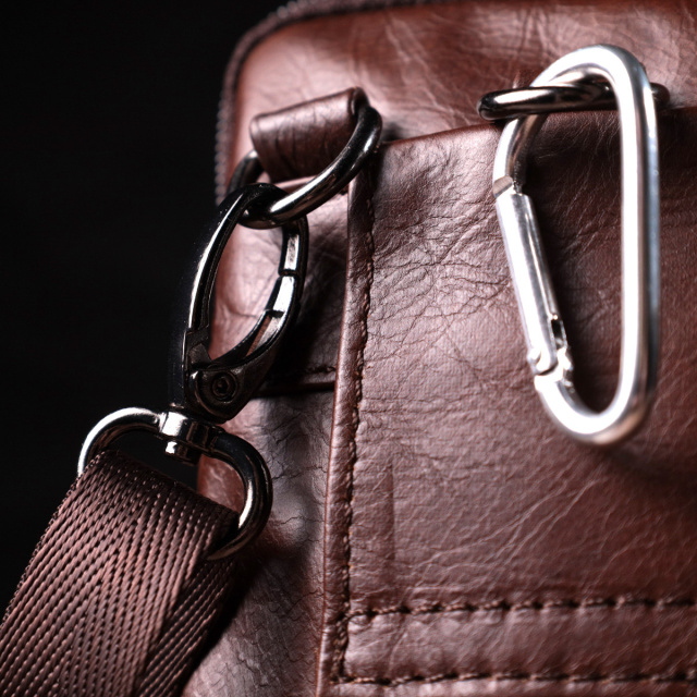- карабін. Практична сумка із натуральної якісної шкіри, яка прослужить не один рік. Модель має дуже зручний функціонал. Носити її можна як барсетку на поясі за допомогою петельки або підчепивши її за допомогою карабіна, а також на плечі за допомогою знімного текстильного ременя. Ідеальний варіант для цінних речей у дорогу, тому що така сумка завжди буде під рукою. Виробництво – фабричний Китай. Сумка стане чудовим подарунком для будь-якого чоловіка.