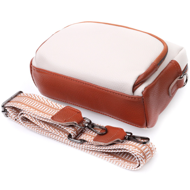 - знімний текстильний ремінь. Відмінна жіноча сумка на кожен день із натуральної шкіри. У виробі використана шкіра білого та коричневого кольору. Притягує погляд у виробі текстильний ремінь із гарним малюнком. Аксесуар складається з основного відділення, потайної кишені на блискавці та кишені відкритого типу, а також двох кишень зовні на лицьовій та тильній стороні. Носити сумку можна в руці, під рукою, на плечі і через плече, для цього є текстильний ремінь, що знімається. В аксесуарі використано якісну фурнітуру кольору темного срібла. Відмінний варіант для подарунка близьким та дорогим дівчатам та жінкам. ОПЛАТА та ДОСТАВКА : накладний платіж з передоплатою 200 грн.Терміни відправлення : 1-3 робочих днів