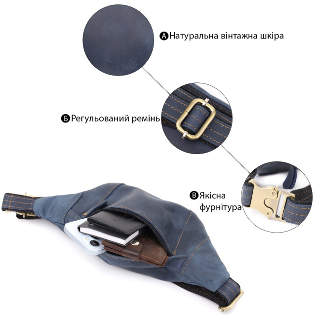 - стильна прошивка деталей коричневою ниткою підкреслює вінтажний характер аксесуара. Сумка-бананка із натуральної шкіри у стильному синьому кольорі – вибір для динамічних та впевнених. Ця компактна сумка-бананка від українського бренду виконана з натуральної шкіри насиченого синього кольору, що надає аксесуару свіжості та оригінальності. Це не просто сумка - це зручне та стильне рішення для активного способу життя. Сумка-бананка ідеально підходить для міста, прогулянок, поїздок та подорожей, коли важливо тримати все необхідне під рукою і при цьому не перевантажувати образ. Форма «бананки» забезпечує максимальний комфорт: її можна носити як на поясі, так і через плече, а щільний ремінь, що регулюється, легко підлаштовується під ваш стиль і зріст. Основне відділення блискавки надійно захищає вміст, а металева фурнітура підкреслює якість виконання. Синій колір робить цю модель особливо універсальною: він поєднується як із класичними, так і з повсякденними вбраннями, додаючи в образ родзинку та індивідуальність. ОПЛАТА та ДОСТАВКА : накладний платіж з передоплатою 200 грн.Терміни відправлення : 1-3 робочих днів