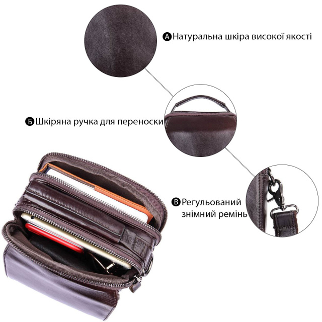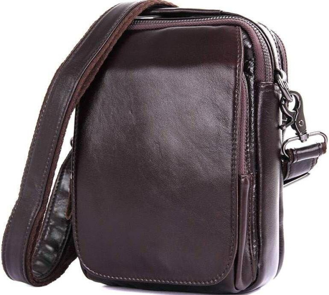 - регульований плечовий ремінь, що знімається. Коричнева чоловіча сумка, має компактні розміри і приємну на дотик м'яку шкіру. Вона прекрасно виглядає і зручна у використанні, її можна носити в руці і на плечі (за допомогою плечового ременя, який йде в комплекті). У цій сумці можна носити багато невеликих аксесуарів, таких як невеликий блокнот, гаманець, візитки, переносна зарядка для телефону, ну і сам телефон. Вона прекрасно підійде для подарунка чоловікові до будь-якого свята ну або просто так.