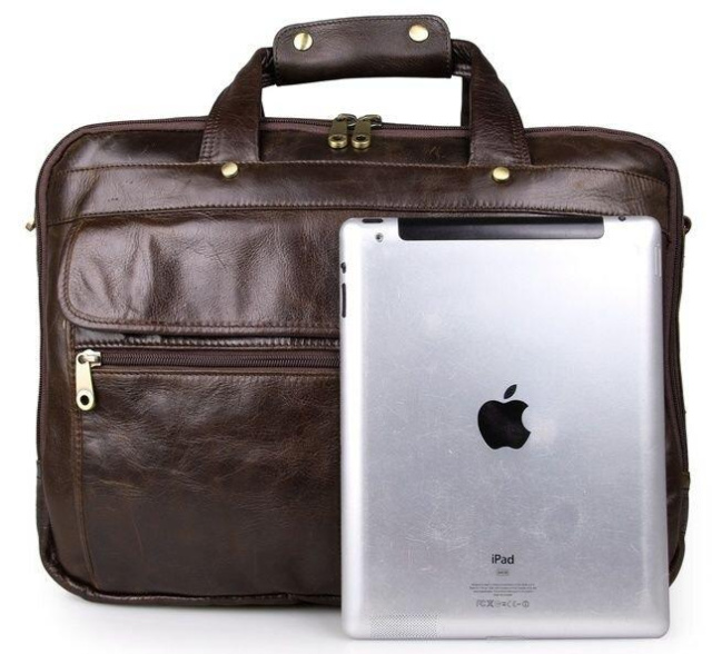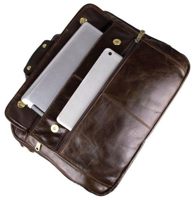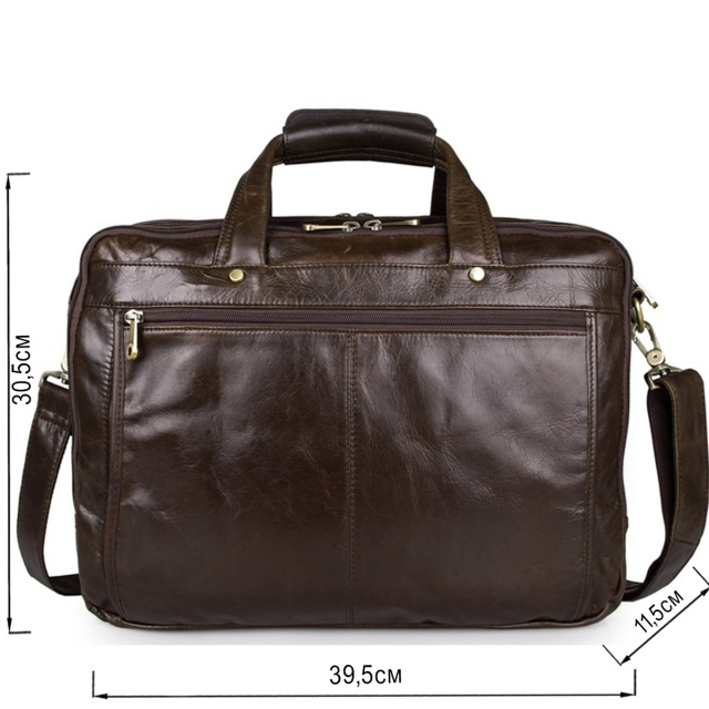 Розміри: 39.5 на 30.5 на 11.5 см. Вмістка шкіряна чоловіча сумка коричневого кольору. Аксесуар відрізняється багатофункціональністю та високою якістю пошиття. Колір фурнітури: латунь. На лицевій стороні знаходиться відділення на блискавці, а також велика накладна кишеня на двох магнітних кнопках. На задній зовнішній стороні розташована велике відділення на блискавці. Підкладка виконана з міцного текстильного матеріалу темно-коричневого кольору.