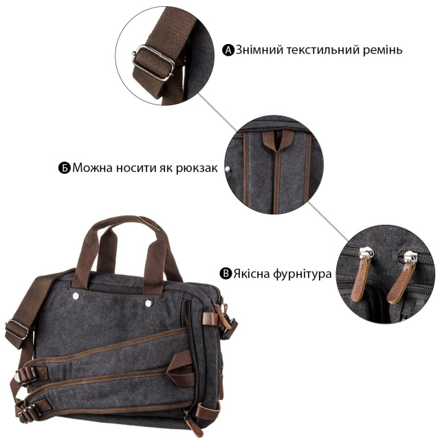 Сумка з міцного текстилю підійде як для чоловіка, так і для жінки. Аксесуар зроблений в Китаї і має достатню кількість різноманітних кишеньок. В сумку ви легко помістите всі найнеобхідніші речі. Усередині сумки є кишеня для ноутбука. В виріб поміститься 15 дюймовий ноутбук. Дана модель не мазка і легко стирається при необхідності. Текстильна сумка хороша альтернатива сумці зі шкірозамінника. Виріб також має міцну фурнітуру. Сумка буде хорошим подарунком для ваших близьких. ОПЛАТА та ДОСТАВКА : накладний платіж з передоплатою 200 грн.Терміни відправлення : 1-3 робочих днів