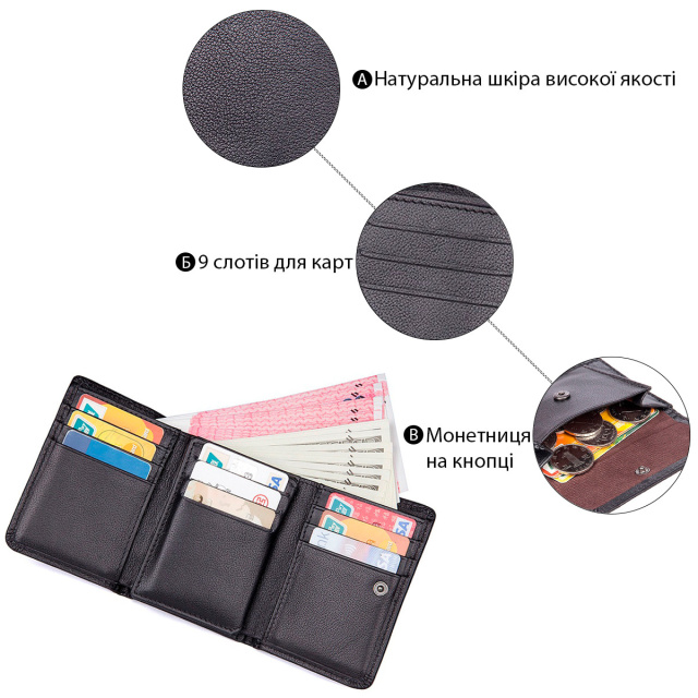 Колір: чорний. Зручний чоловічий шкіряний гаманець. Аксесуар міцно прошитий по діагоналі ниткою чорного кольору. Всередині гаманець має велику кишеню для купюр, які поміщаються в розгорнутому вигляді. Усередині гаманця є відділення для карток і прозора кишеня для документів. Сам аксесуар складається в два рази і закривається на кнопку. На задній стороні аксесуара розташована монетниця, яка надає власнику гаманця швидкий доступ до монет, не відкриваючи при цьому сам гаманець. Гаманець легко поміщається в кишеню будь-яких штанів і не займає багато місця в сумці або середніх розмірів борсетки. Гаманець упакований в текстильний пилозахисний чохол. ОПЛАТА та ДОСТАВКА : накладний платіж з передоплатою 200 грн.Терміни відправлення : 1-3 робочих днів
