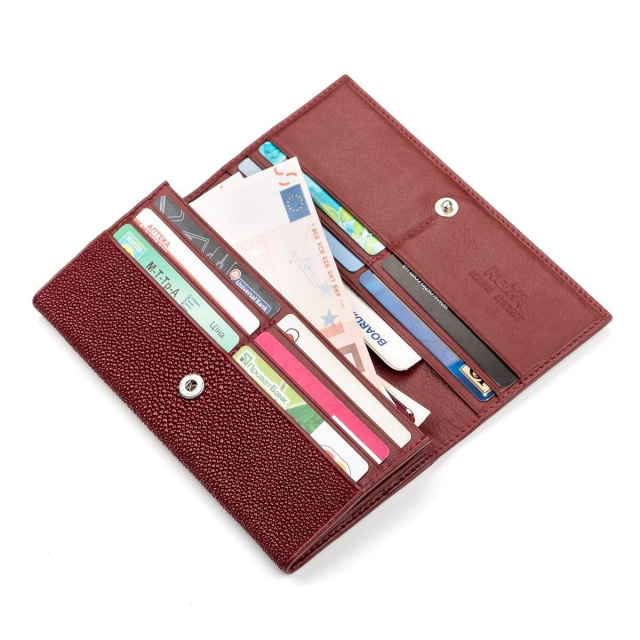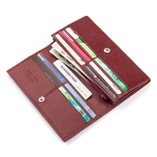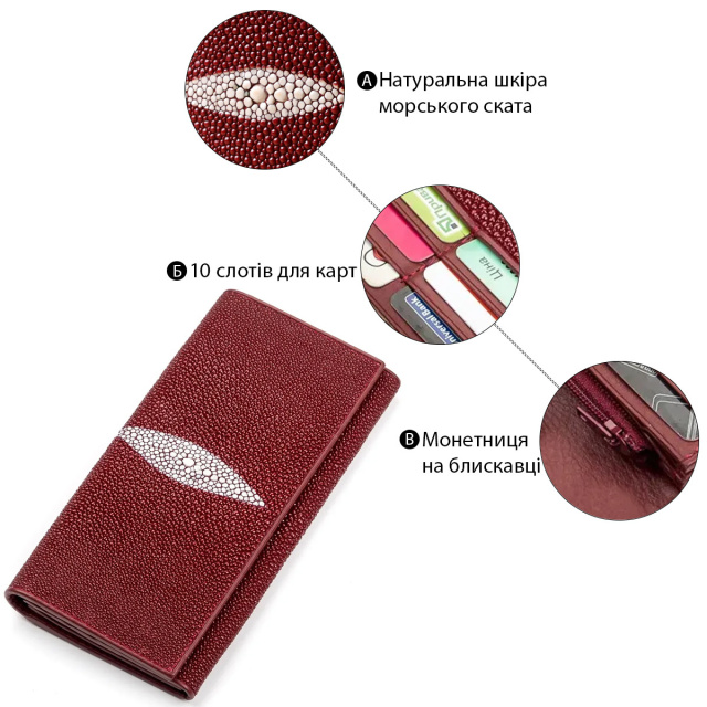 - надійно застібається клапаном на кнопку. Оригінальний жіночий гаманець з натуральної шкіри морського ската, яка володіє фантастичною фактурою і красою, а також є дуже стійкою до зносу, проколів, порізів, до розривів і навіть до вогню. Аксесуар обшитий гладкою шкірою під колір виробу. Весь простір шкіри покрито сотнями дрібних горбків, різного розміру, які грають на світлі, як невеликі намистинки. На лицьовій поверхні гаманця, у вигляді прикраси розташований малюнок, біле вічко з більш великими намистинами. Вироби зі шкіри ската прослужать довгі роки, не втрачаючи свого первісного вигляду. Якщо Ви хочете приємно здивувати близьку людину - подаруйте їй виріб зі шкіри морського ската.