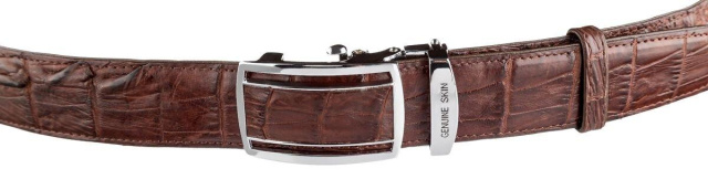 Дуже красивий ремінь з екзотичної, натуральної шкіри крокодила (каймана). Аксесуар виготовлений на основі гладкої телячої шкіри і прошитий коричневою ниткою з обох сторін. Виріб обладнано автоматичною пряжкою, яку можна зняти. Пряжка декорована вставкою, з натуральної шкіри крокодила. Вироби зі шкіри крокодила завжди вважалися великою розкішшю, так як в світі не так вже й багато компаній, які займаються виробленням такої шкіри, оскільки цей процес дійсно надзвичайно трудомісткий. Оскільки рептилія основну частину життя живе в воді, водостійкість у виробів з їх шкіри найвища. Ідеальний подарунок для людей, які люблять дорогі й якісні речі. Кожне полотно має унікальний візерунок, який не повторюється, тому, купуючи ремінь зі шкіри крокодила, ви можете бути повністю впевнені в тому, що іншого такого ременя немає в природі.