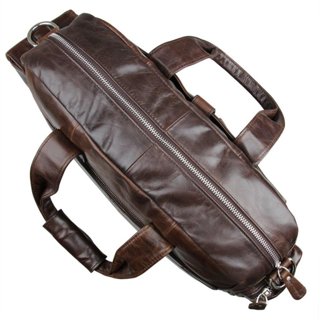 Розміри: 38 на 30.5 на 10 см. Багатофункціональна чоловіча шкіряна сумка коричневого кольору. Колір фурнітури: срібло. На лицевій стороні розташовані дві накладні кишені на блискавці під клапанами, а також одина велика кишеня, яка закривається шкіряним хлястиком на кнопці. На задній зовнішній стороні виробу знаходиться відділення на блискавці. Сумку можна носити в руці за допомогою зручних шкіряних ручок, а також через плече (в комплекті є, регульований плечовий ремінь). На бічних гранях виробу знаходяться накладні кишені. Аксесуар упакований в текстильний пилозахисний чохол білого кольору. Всередині: