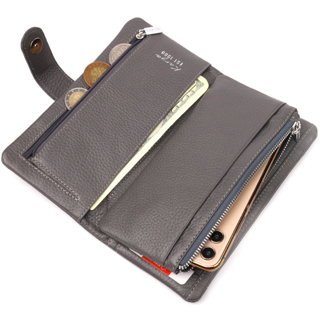 - виріб упакований у фірмову коробку. Вертикальний жіночий гаманець з натуральної зернистої шкіри, в сірому кольорі. Внутрішній розворот складається з чотирьох відкритих відділень для купюр, однієї кишені з розширювачем на застібці, однієї прихованої кишені на блискавці, однієї кишені-перегородки на блискавці, однієї сітчастої кишеньки та дванадцяти секцій для пластикових карток. Складається аксесуар навпіл, з фіксацією на хлястик із магнітом. Такий гаманець з натуральної шкіри – це ідеальний варіант на кожен день для тих, хто цінує якість, зручність та комфорт. ОПЛАТА та ДОСТАВКА : накладний платіж з передоплатою 200 грн.Терміни відправлення : 1-3 робочих днів